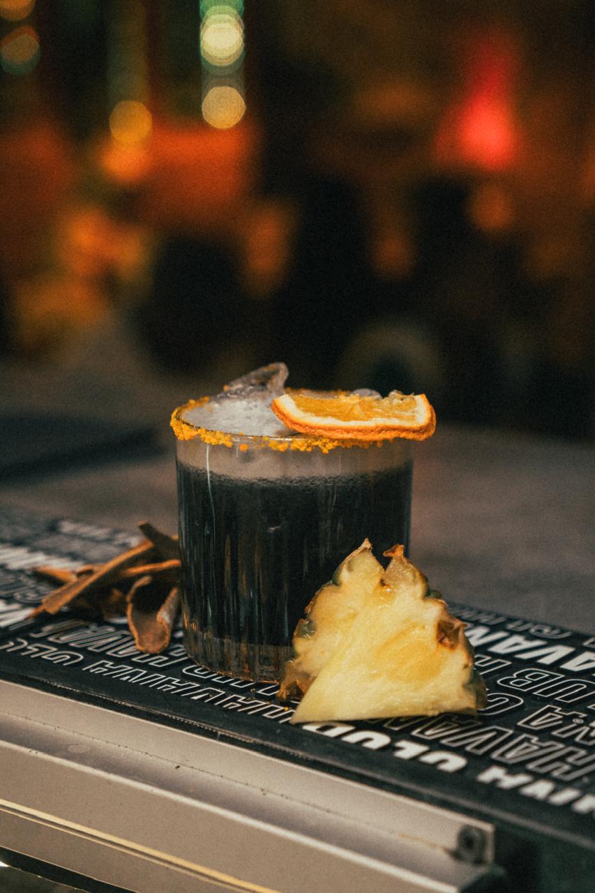 Whiskey, Edible charcoal powder, Cinnamon syrup, Pineapple juice and Egg white