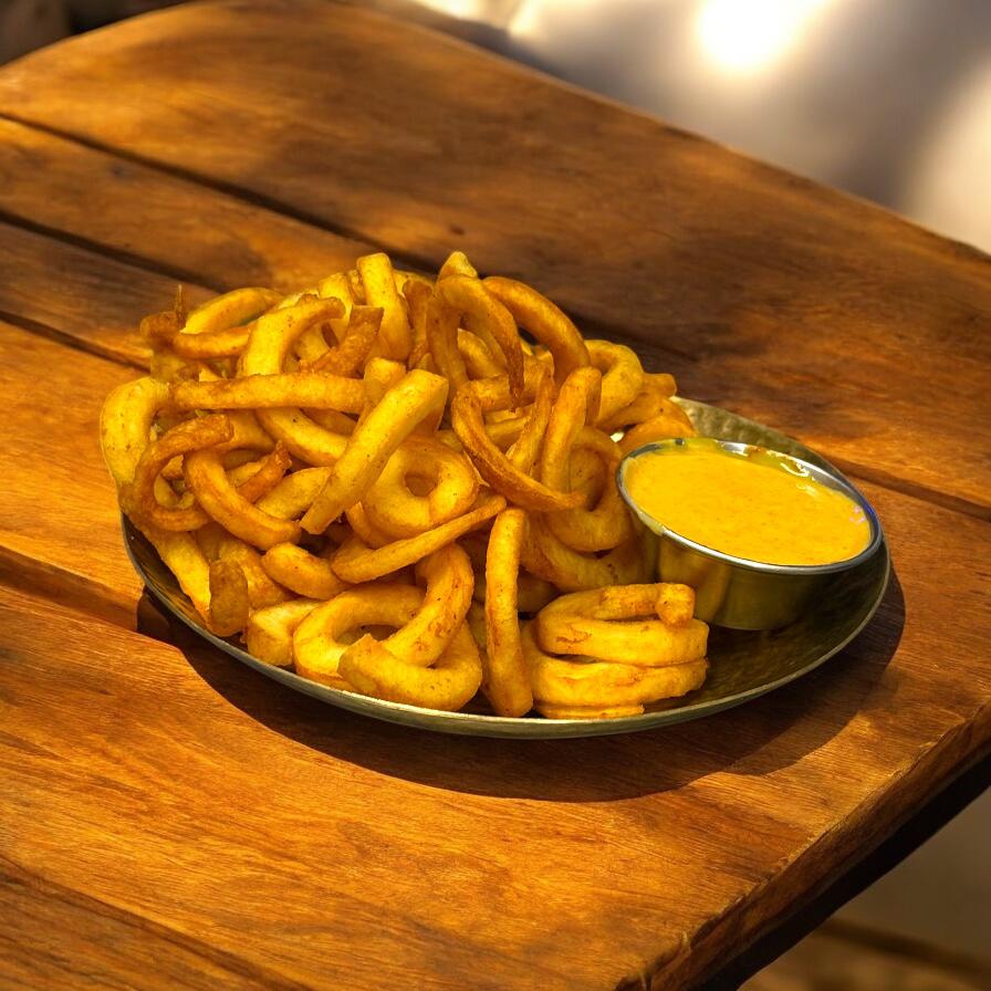 Curly fries, special Coco seasoning, Kentucky Gold sauce, Grana Padano cheese
