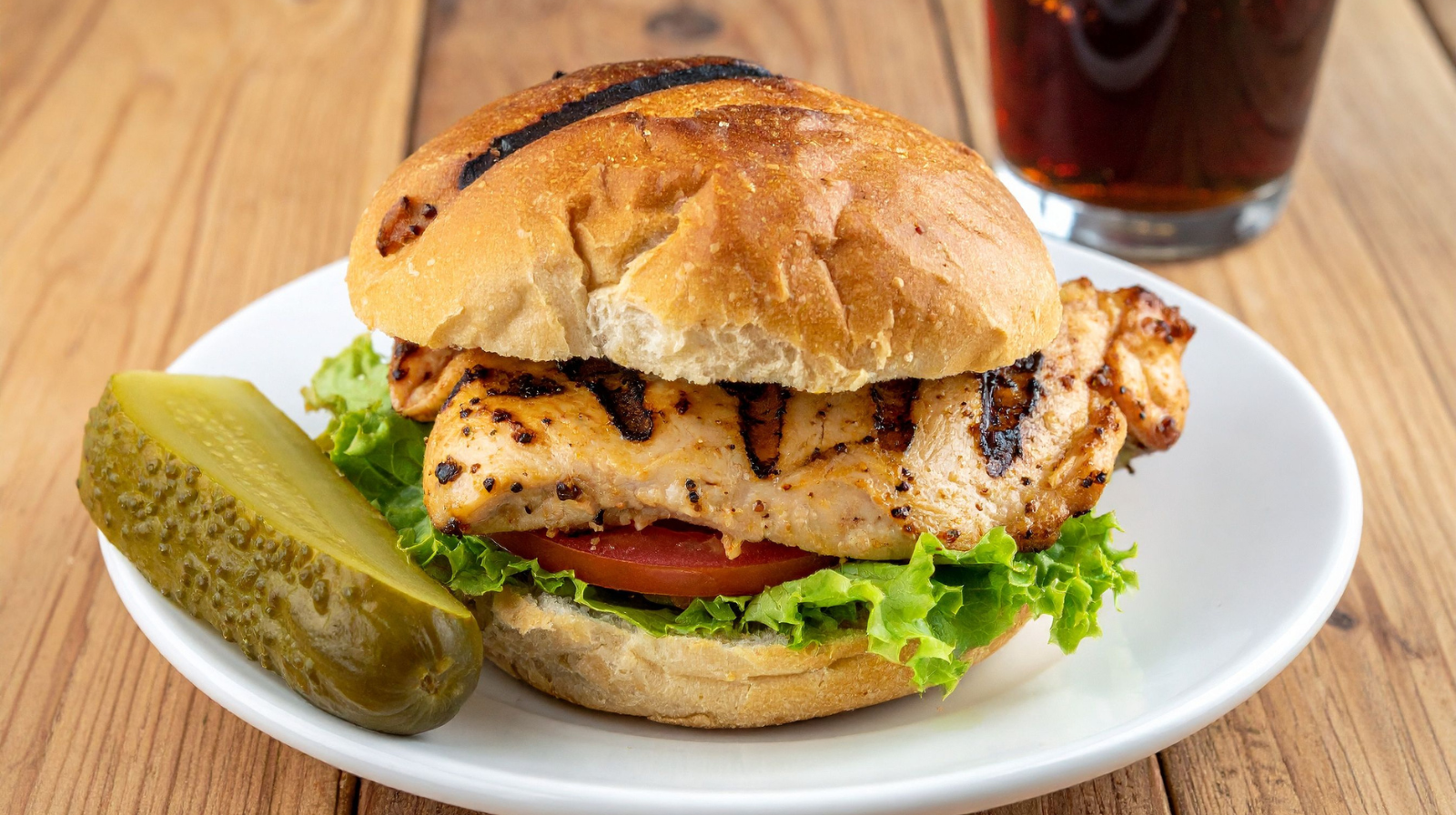 BRIOCHE BUNS, GRILLED CHICKEN THIGHS, GARLIC SOS, ROMAINE LETTUCE, CHEDDAR CHEESE SLICES, RED ONIONS, TOMATO SLICES, PICKLED CUCUMBER.